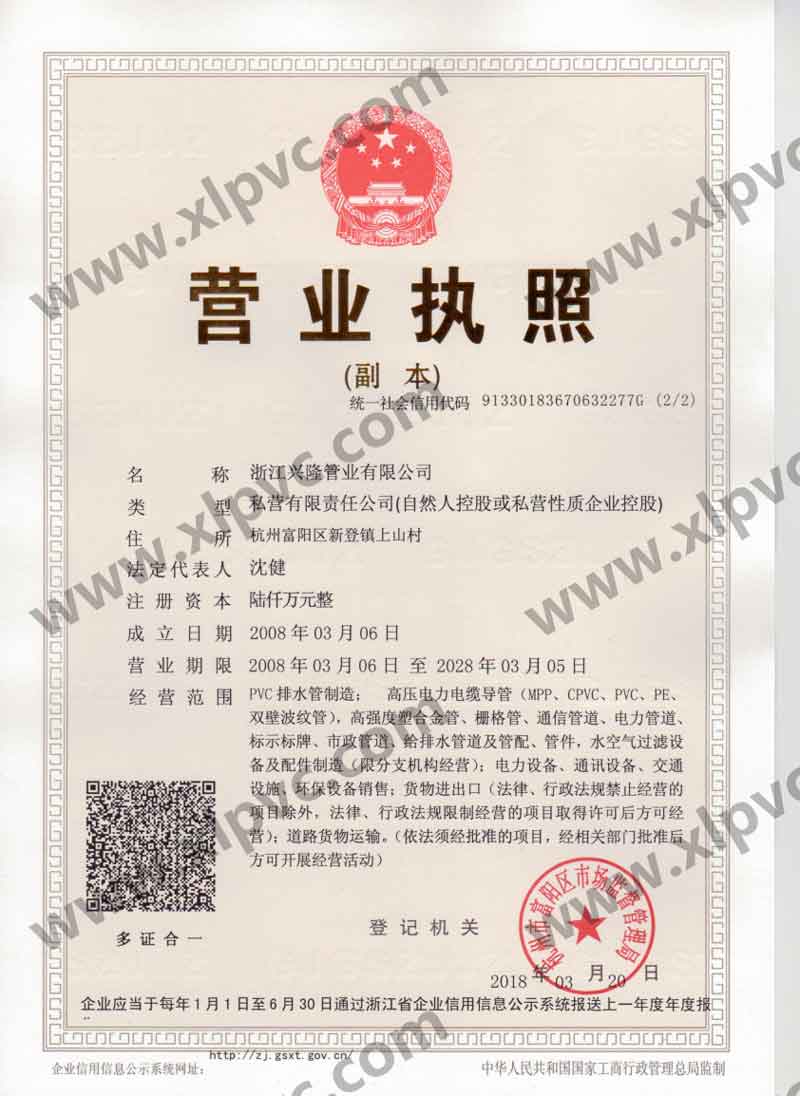 浙江興隆管業(yè)有限公司位于杭州市富陽區(qū)(杭州第九新區(qū)),坐落在新登鎮(zhèn),相距杭州僅60公里,水、陸、空交通運輸十分便利。浙江興隆管業(yè)有限公司前身為富陽興隆塑料制品廠,成立于1992年,2008年改名浙江興隆管業(yè)有限公司,數(shù)十年來,公司一直至力于管道的生產(chǎn),目前公司擁有國內(nèi)先進(jìn)的CPVC保護(hù)管生產(chǎn)線,HPVC()雙壁波紋管生產(chǎn)線,多孔管生產(chǎn)線,玻璃鋼電纜保護(hù)管生產(chǎn)線、MPP電纜保護(hù)管生產(chǎn)線。生產(chǎn)的主要產(chǎn)品有:CPVC電纜保護(hù)管、MPP電力電纜保護(hù)管(頂管)、高強(qiáng)度塑合金管、HDPE給排水管、HPVC()雙壁波紋管、玻璃鋼電纜保護(hù)管、埋地通信用的PVC-U多孔管、PE直壁管、PVC-U雙壁波紋管、梅花管等,年生產(chǎn)能力達(dá)20000萬米。